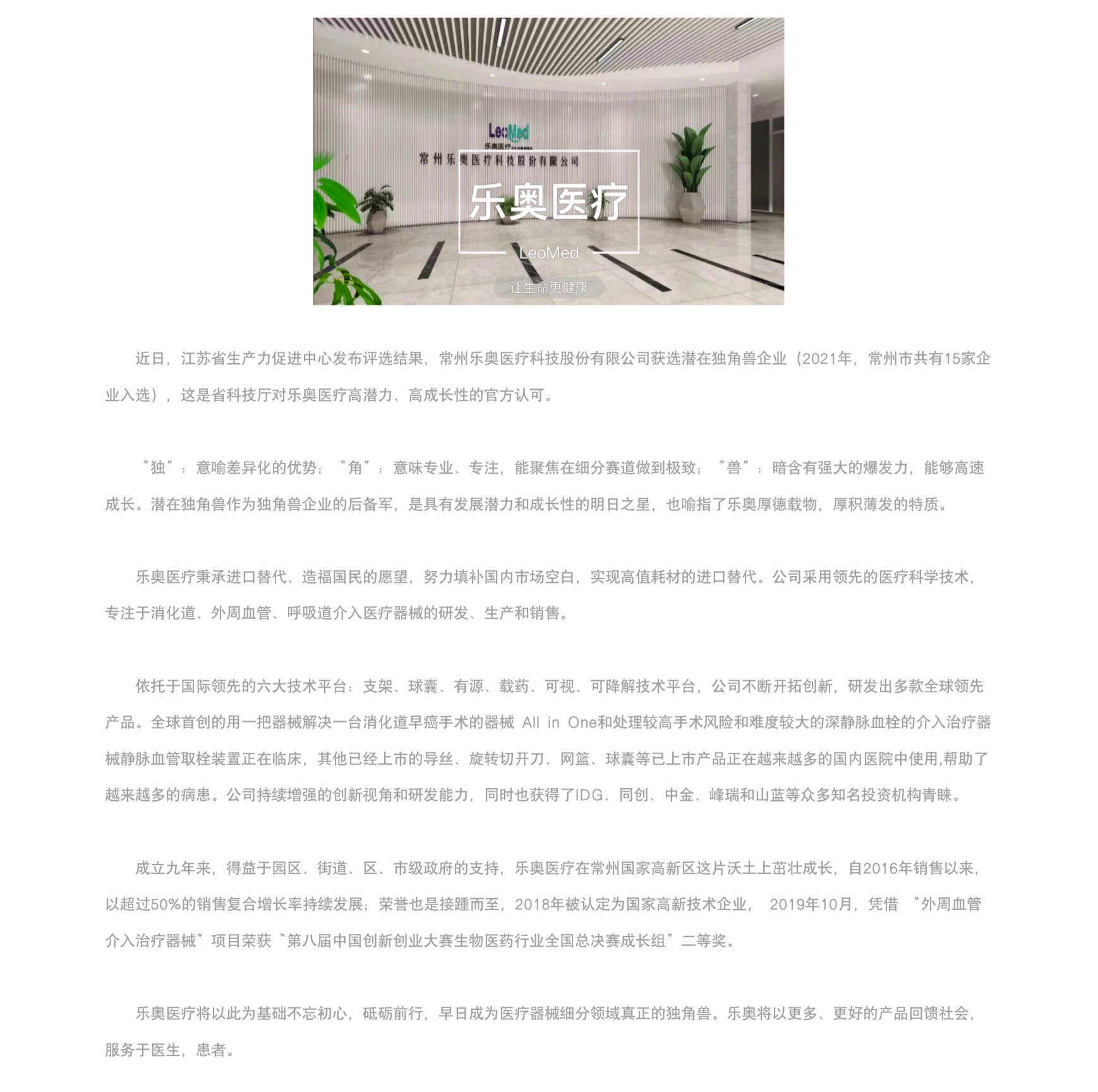 「樂奧醫療」入選江蘇省2021年潛在獨角獸企業!